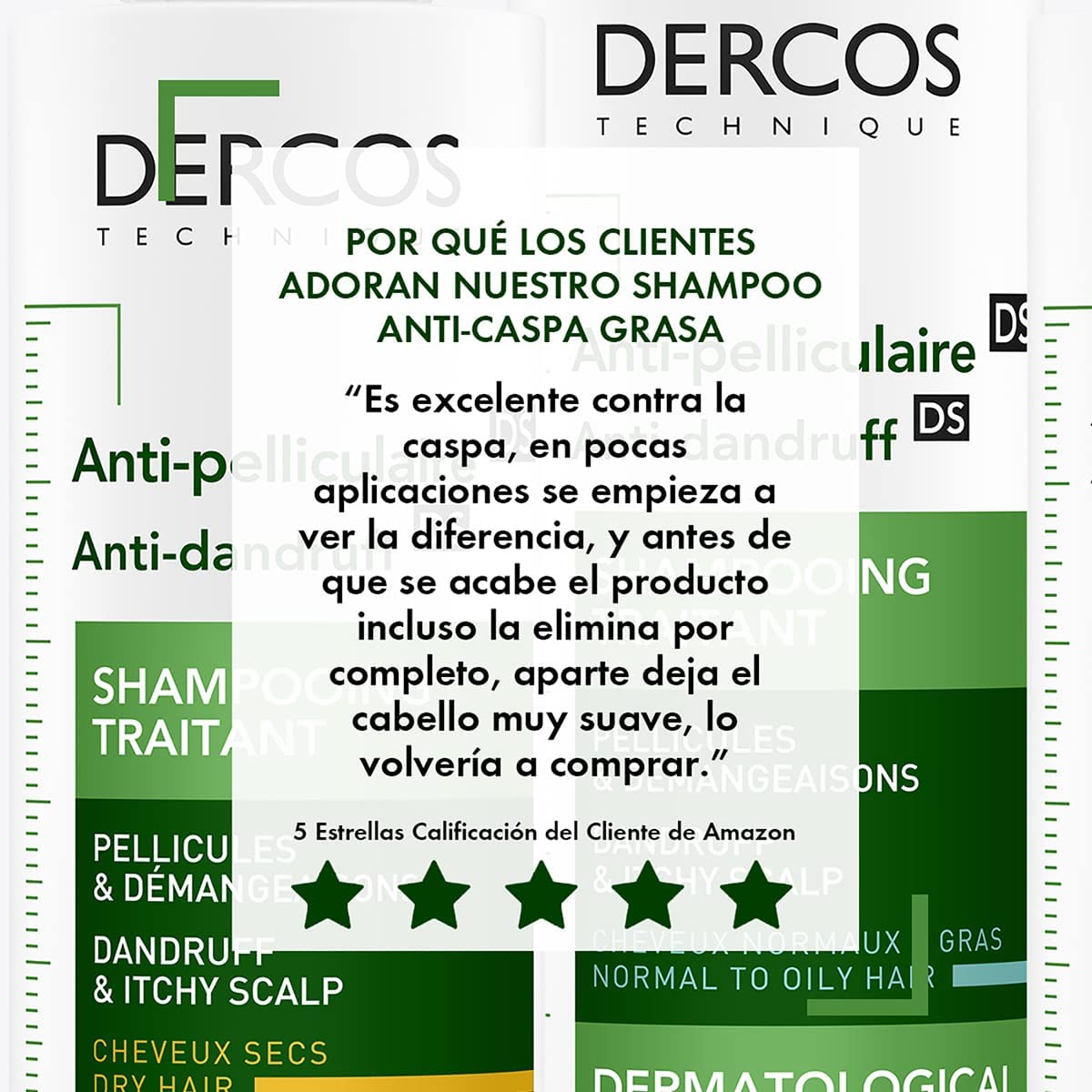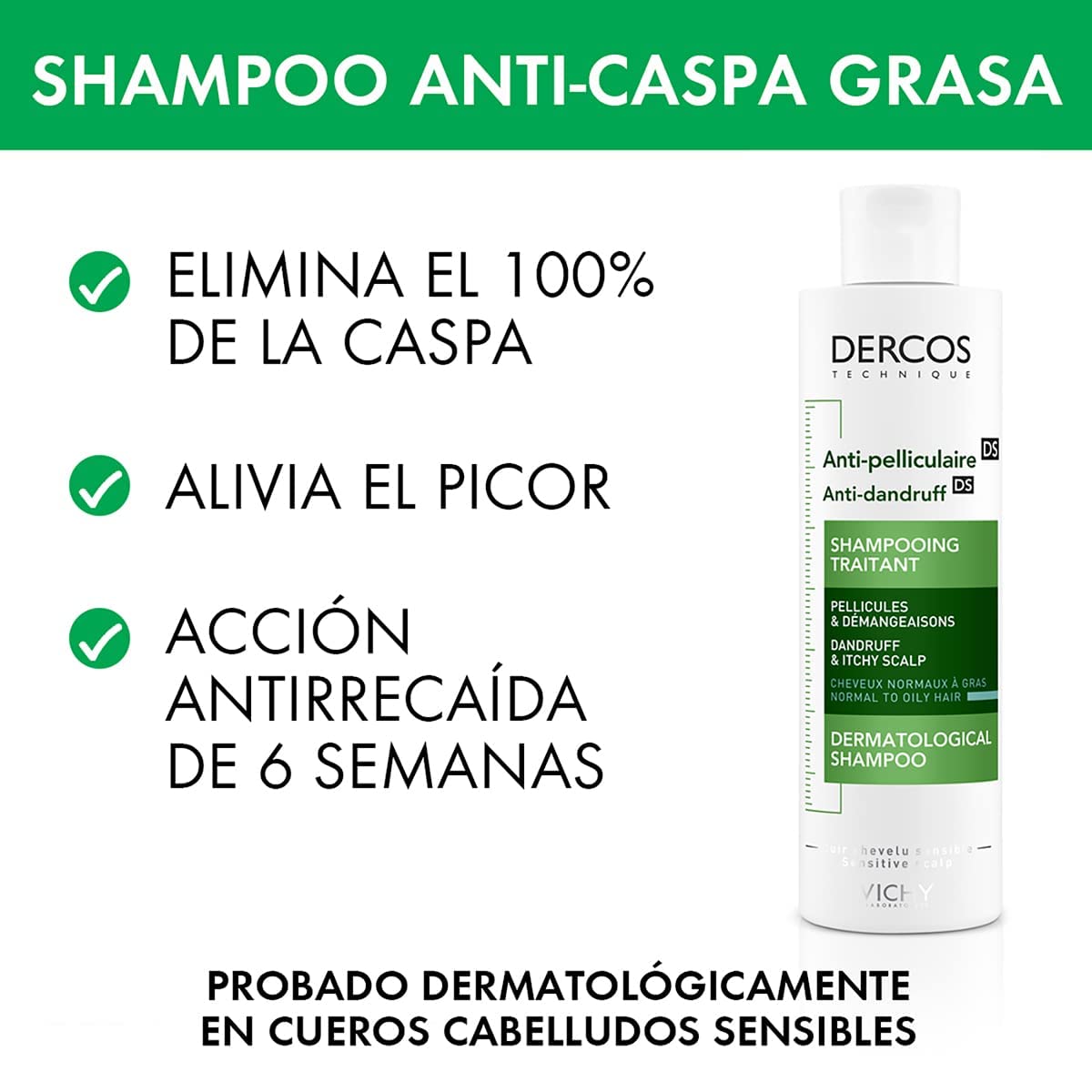 Dercos treatment anti dandruff shampoo for balancing normal to greasy hair, eliminates the fungal micro-organism responsible for dandruff and removes dead cells to cleanse the scalp.