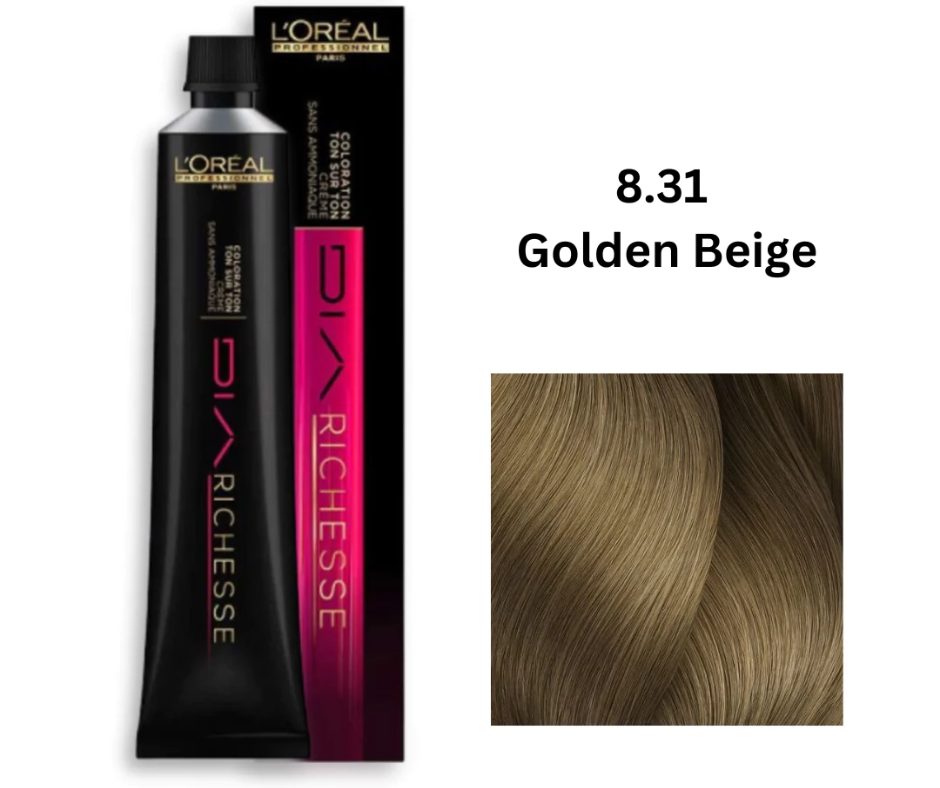 Loreal Professional Dia Richesse 8.31 Shade- Golden Beige 50ml, tone-on-tone coloration process, for rich, deep reflects and exceptional soft feel. Ideal for blending away your first grey hairs leaving it with a natural-looking color.