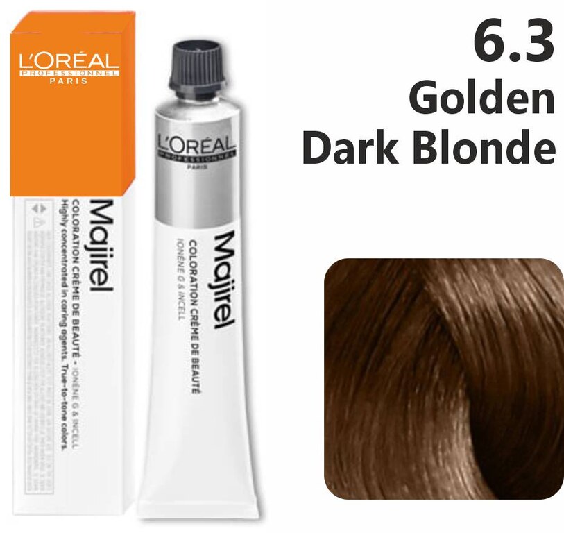 Majirel by l'oréal Shade No 6.3, Shade: Golden Dark Blonde, 6.3 Golden Dark Blonde provides a saturated, long-lasting color result. This permanent hair color is designed to cover gray hair and gives natural-looking dark blonde tones.