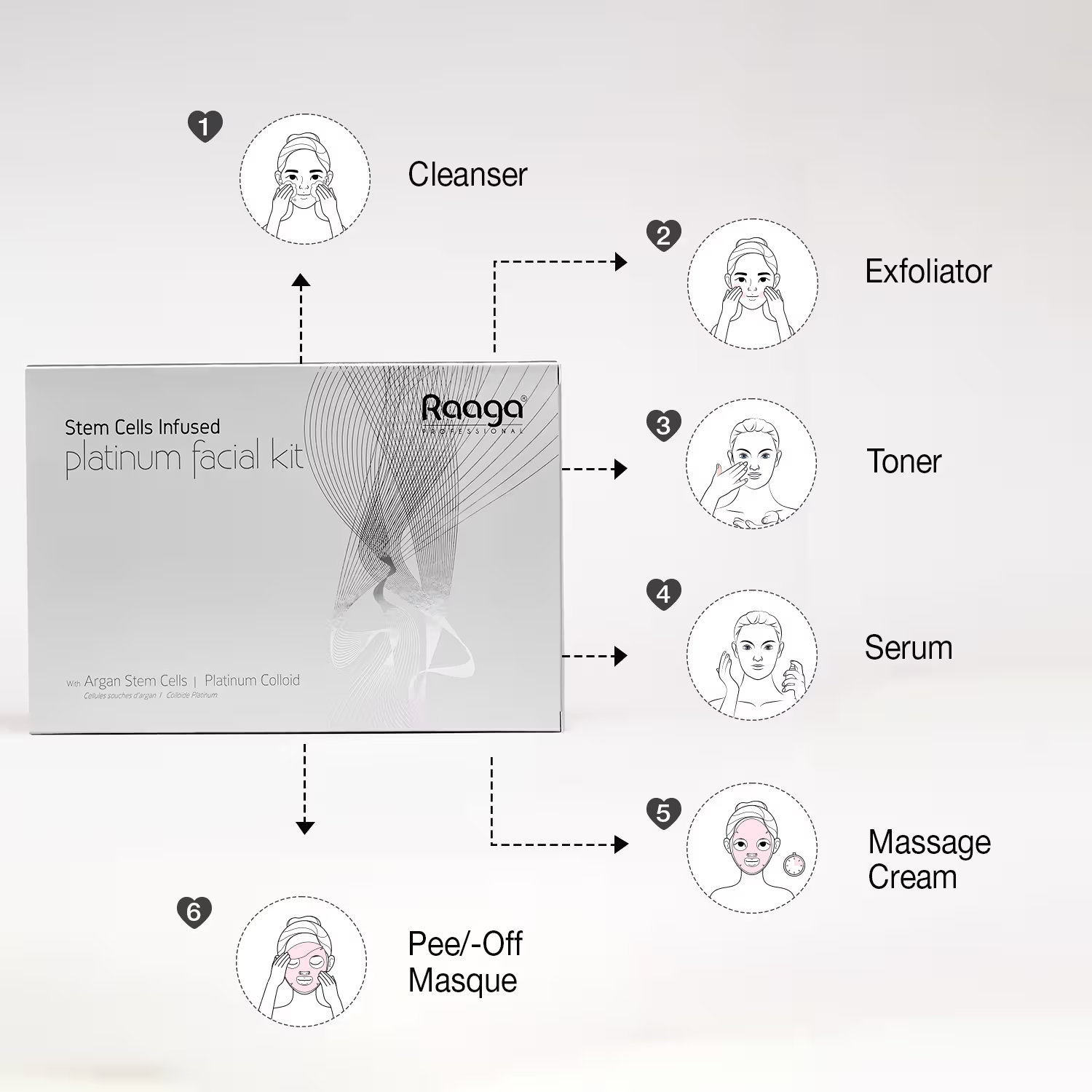 Raaga Professionals Stem Cells Infused Advance Facial Platinum kit with argan stem cells aids in reducing wrinkles, tightens and tones skin and helps in enhancing skin firmness, density and boosts collagen to rejuvenate the skin.