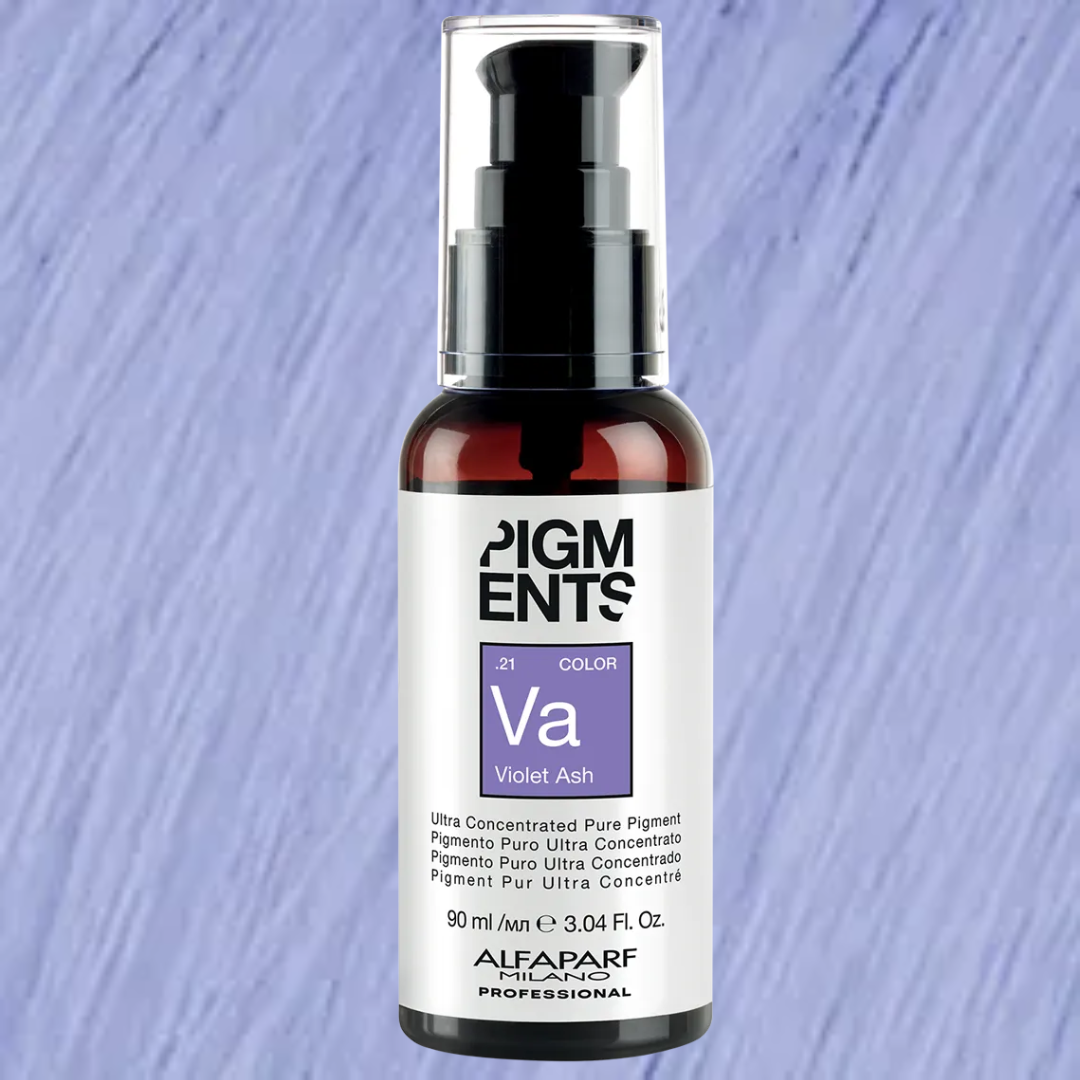 Violet Ash .21 from the Pigments line is a hair color that amplifies cool blonde tones and revives grey/white hair. It can be mixed with a wide variety of products to revive and keep colors looking vibrant and bright.