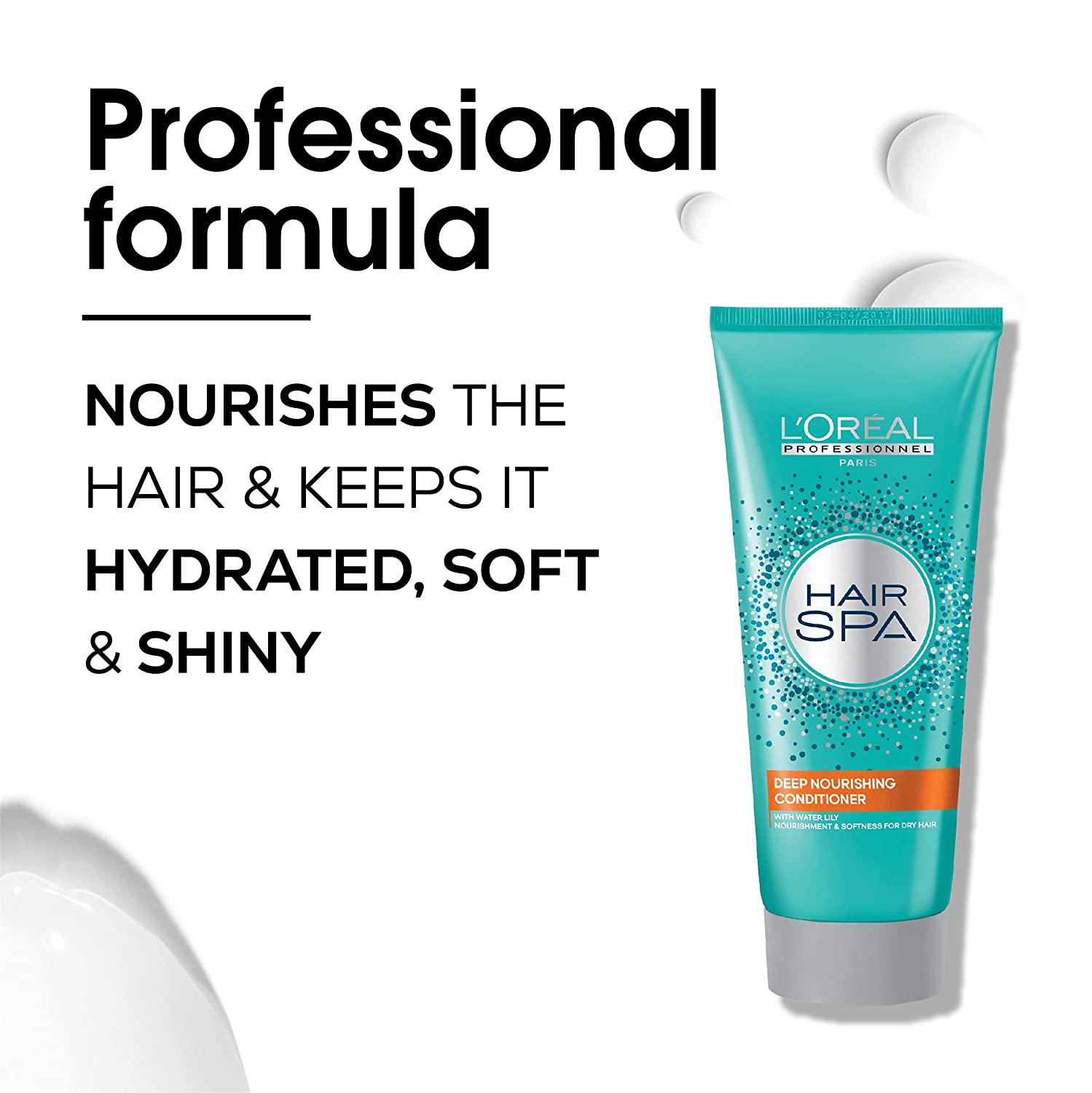 El acondicionador Hair Spa Deep Nourishing de L'Oréal Professionnel está enriquecido con nenúfar y agua purificada. Este acondicionador, que se puede masajear para el cuero cabelludo, nutre profundamente el cuero cabelludo y el cabello. Infunde nutrientes e hidratación a la fibra capilar, dejándola suave y brillante.
