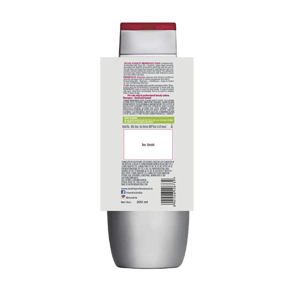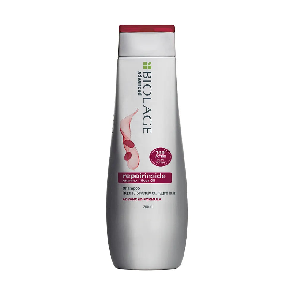 Formulado con arginina y soja, el champú Matrix Biolage Repairinside limpia y acondiciona el cabello severamente dañado para ayudar a restaurar la flexibilidad y el brillo.