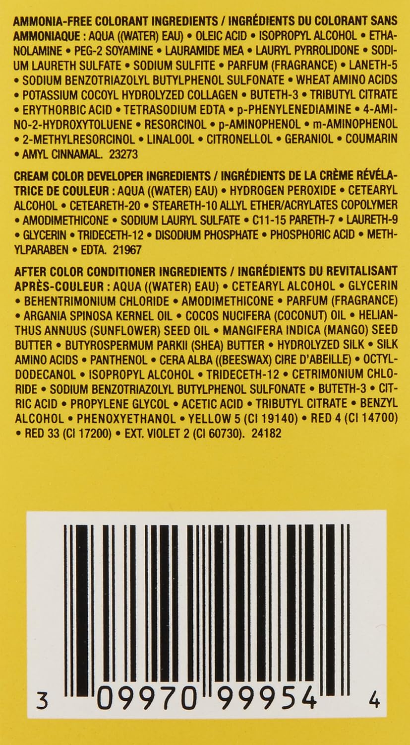 El paquete contiene: 1 colorante sin amoniaco (59,1 ml), 1 revelador en crema (59,1 ml), 1 acondicionador para después del color de 11,8 ml y 1 manual de instrucciones y guantes de aplicación.