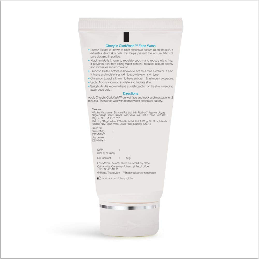Le nettoyant visage ClariWash de Cheryl est un nettoyant visage spécialement formulé pour les peaux grasses sans acné. Il régule le sébum et exfolie en profondeur pour déboucher les pores et éclaircir la peau