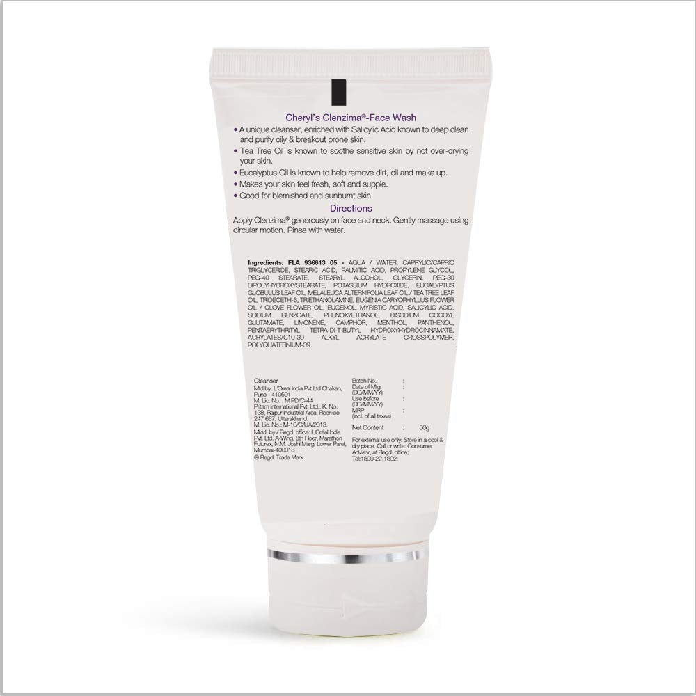 Le nettoyant visage Clenzima de Cheryl contrôle les imperfections sans dessécher la peau et décourage les futures éruptions cutanées en contrôlant l'excès de sébum.