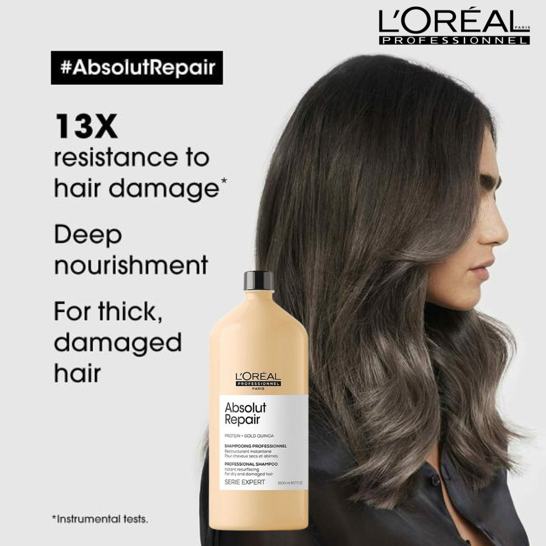 Enrichi en quinoa doré et en protéines de blé, le shampooing et masque nourrissant Série Expert Absolut Repair de L'Oréal Professionnel aide à réparer les cheveux abîmés. Il nourrit et renforce la fibre capillaire, laissant les cheveux doux et hydratés.