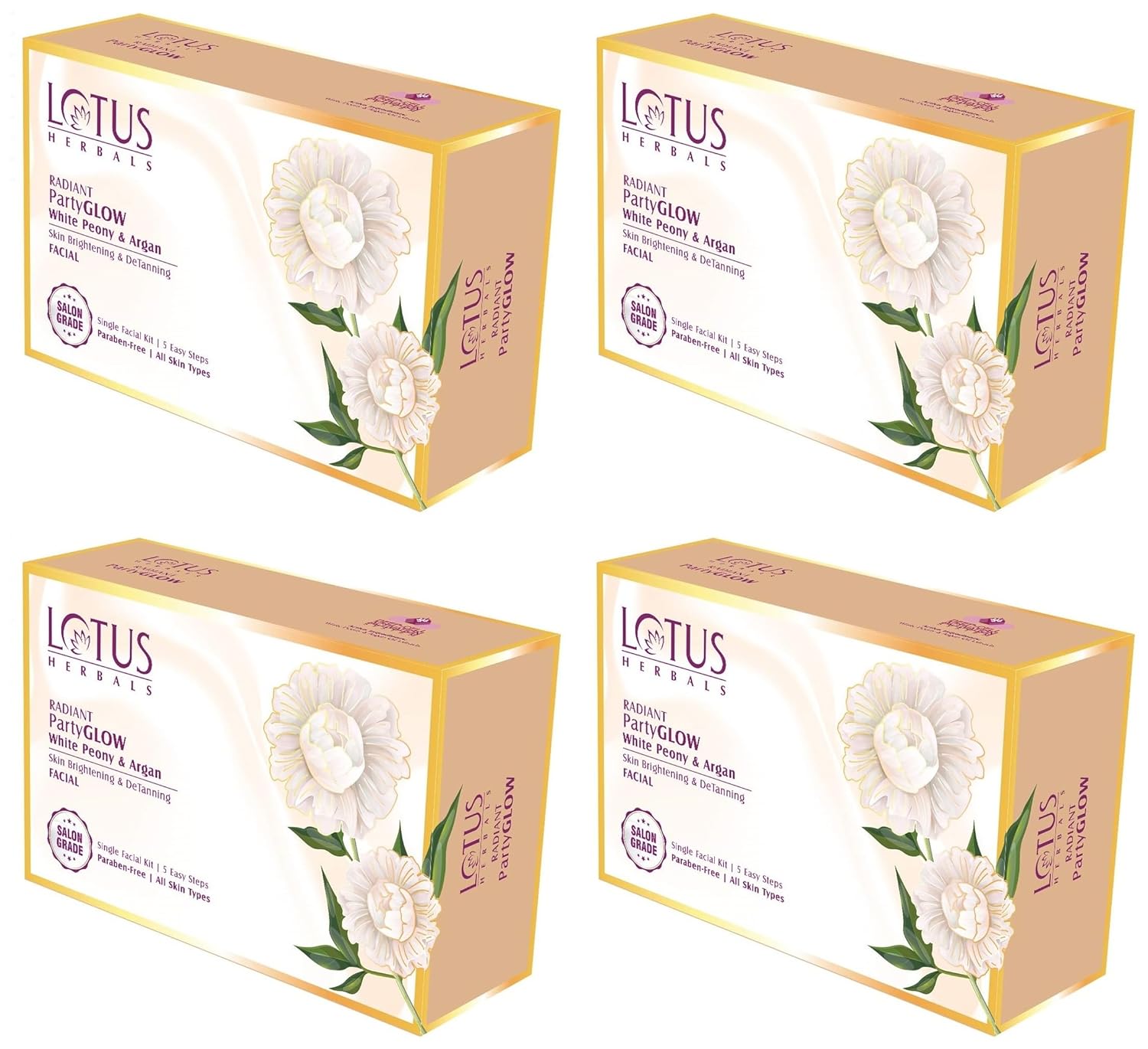 Lotus Herbals Radiant PartyGLOW White Peony & Argan Oil Detanning Facial Kit | 5 Easy Steps | Paraben Free | Salon Grade | All Skin Types | Pack of 4 | 228g
