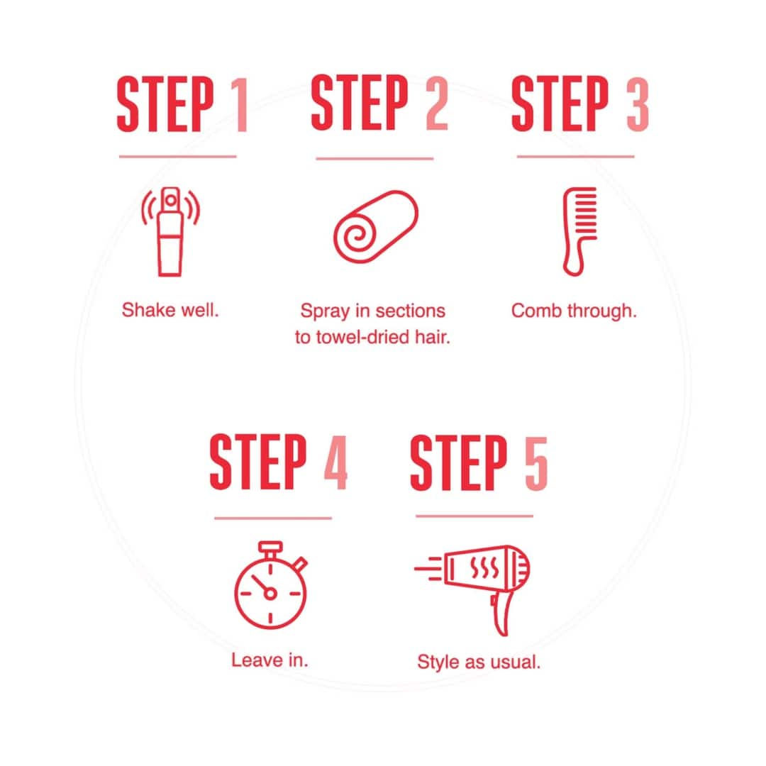Hold the bottle upright and at a little distance from your hair. Spray the mist evenly onto damp or dry hair and leave it in.
